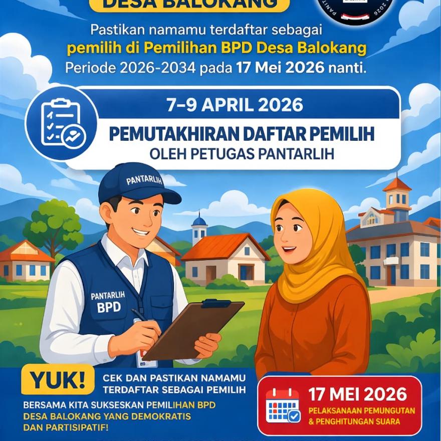 07 April 2026 18:57:40 | Administrator | 22 Kali | Berita DesaSegera cek nama anda di Daftar Pemilih Sementara yang telah diumumkan. Bila belum terdaftar segera daftarkan kepada ketua RT setempat atau kepada Panitia Pengisian BPD Desa Balokang. ..selengkapnya